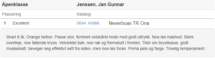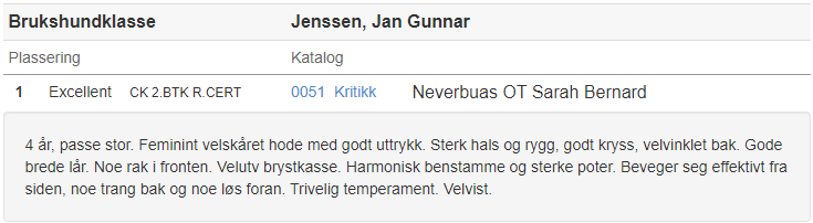 Ona ble stilt i åpen klasse og som den eneste tispe der med Excellent ble hun vinner av klassen. Dattera Sarah Bernard ble stilt i brukshundklassen og hun fikk Excellent m/CK og vant sin klasse. Hun konkurrerte også om kåring av beste tispe og ble nr. to med Res. Cert.