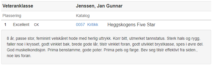 Heggskogens Five Star deltok i veteranklassen og fikk der Excellent m/CK. Som vinner av sin klasse fikk hun også konkurrere i kåringen av utstillingens beste veteran, noe hun også ble.